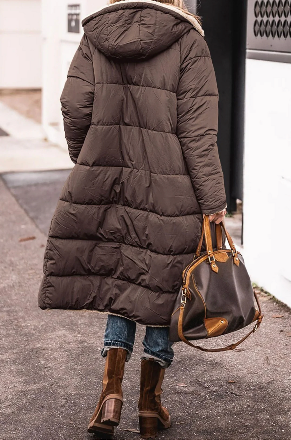 - Doppeldesign: Wechsel zwischen gestepptem Außenmaterial und weichem Sherpa-Innenfutter für zwei Stile in einer Jacke.